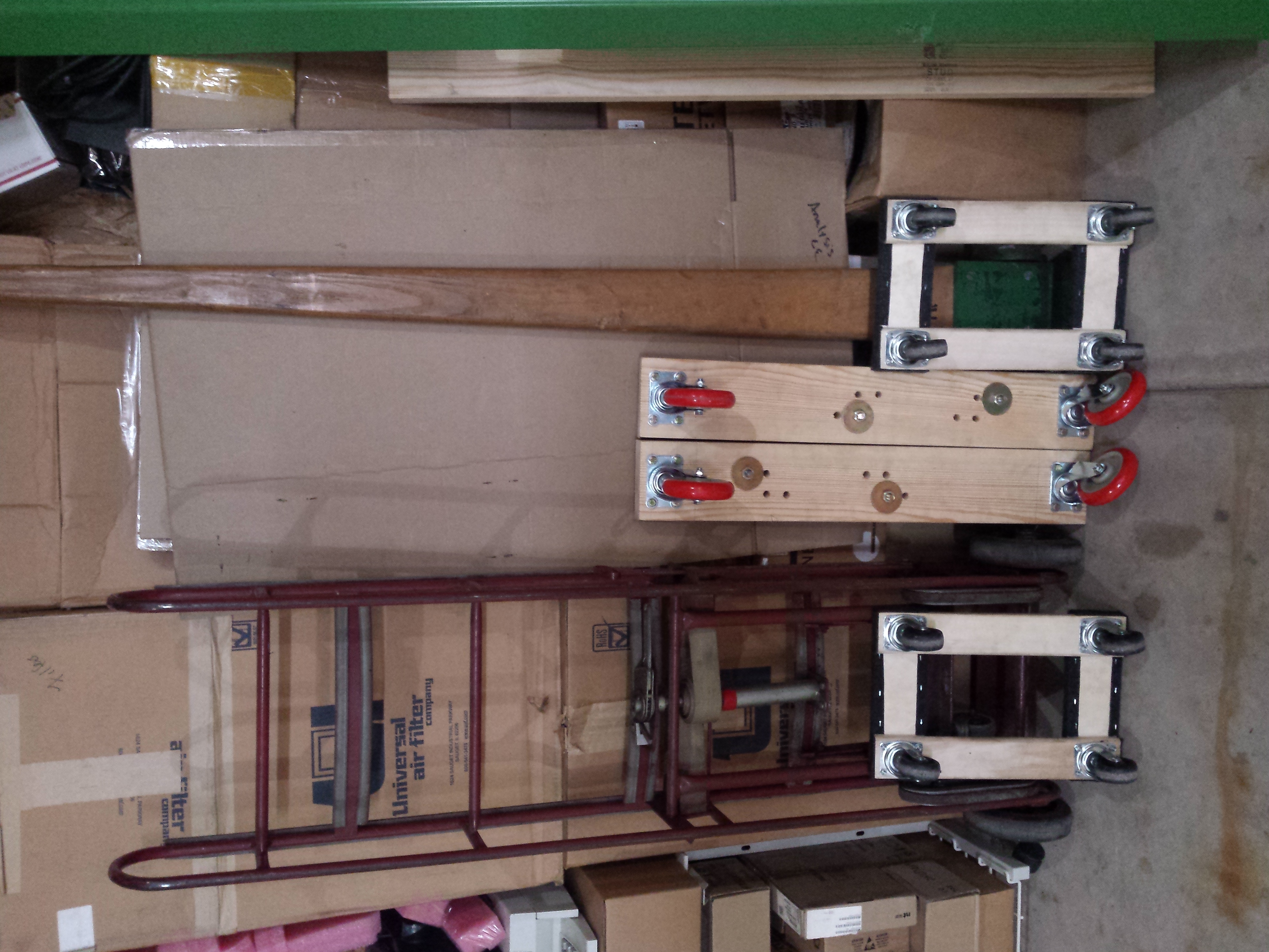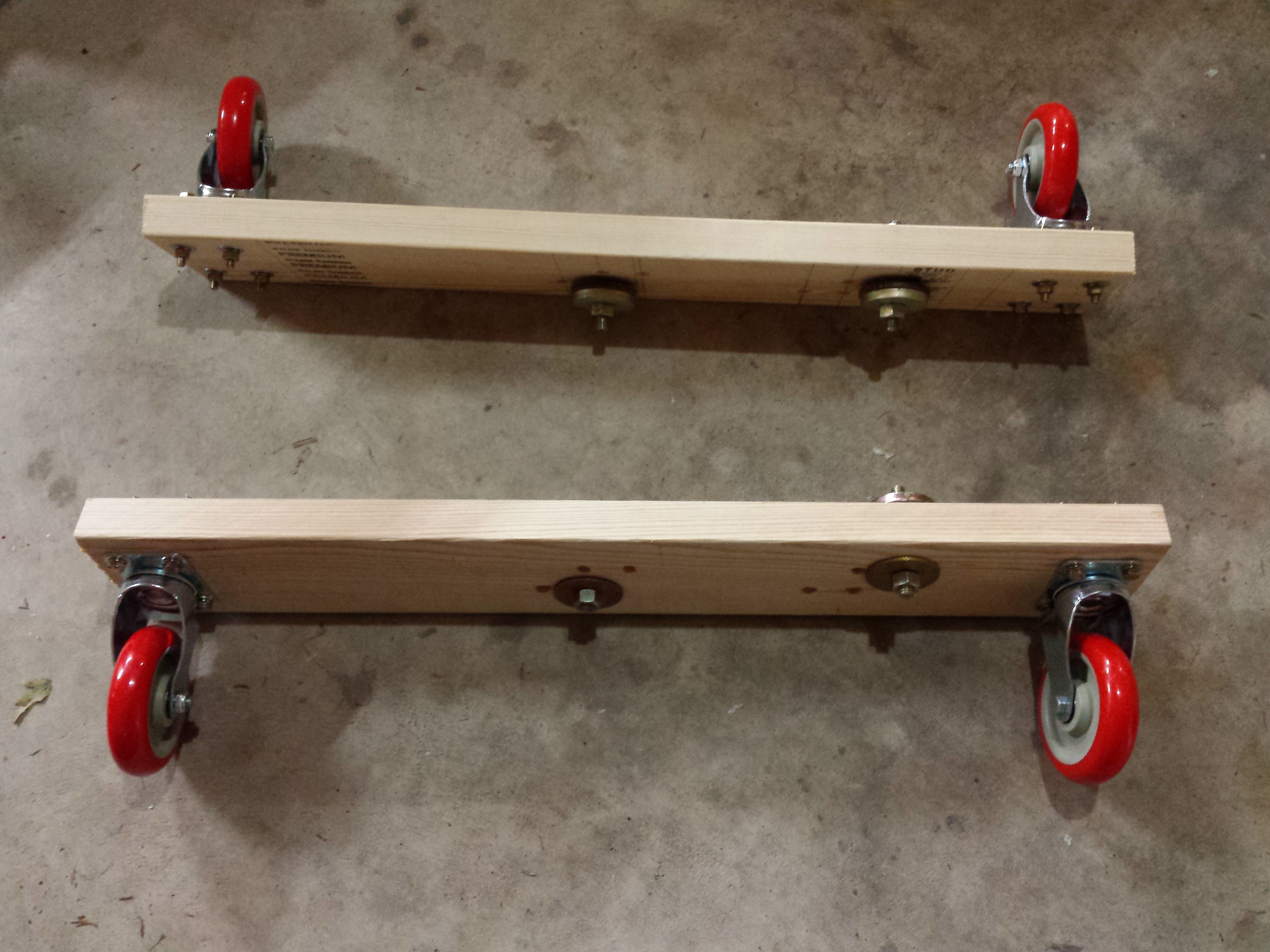 I tried (unsuccessfully) for a while to purchase some machinery movers from someone on craigslist. These are a lot like piano dollies, but a lot stronger and with hydraulic lifting. I eventually gave up on these given the unresponsiveness of the seller and began working on an alternate plan.